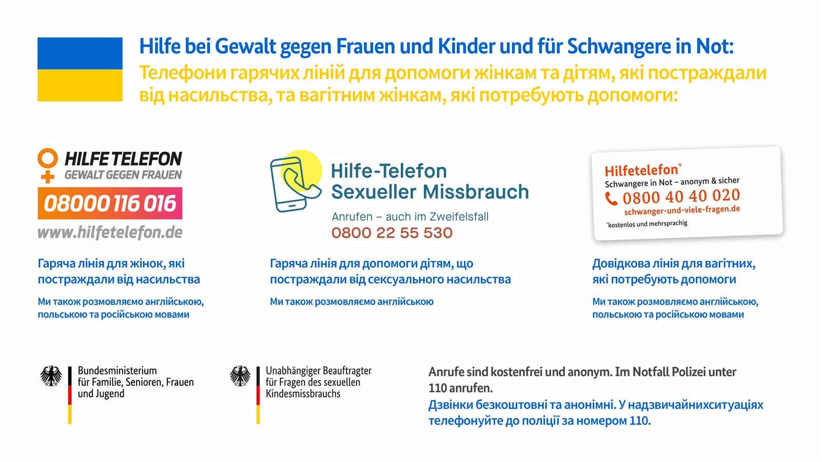 Unterstützen Sie uns, ukrainische Frauen und Kinder zu schützen, indem Sie unsere Informationen über ihre Netzwerke und Communitys und auf Ihren Online-Angeboten bekannt machen und teilen. Hierfür finden Sie in der Anlage Online-Banner sowie Kacheln für Facebook und Instagram.